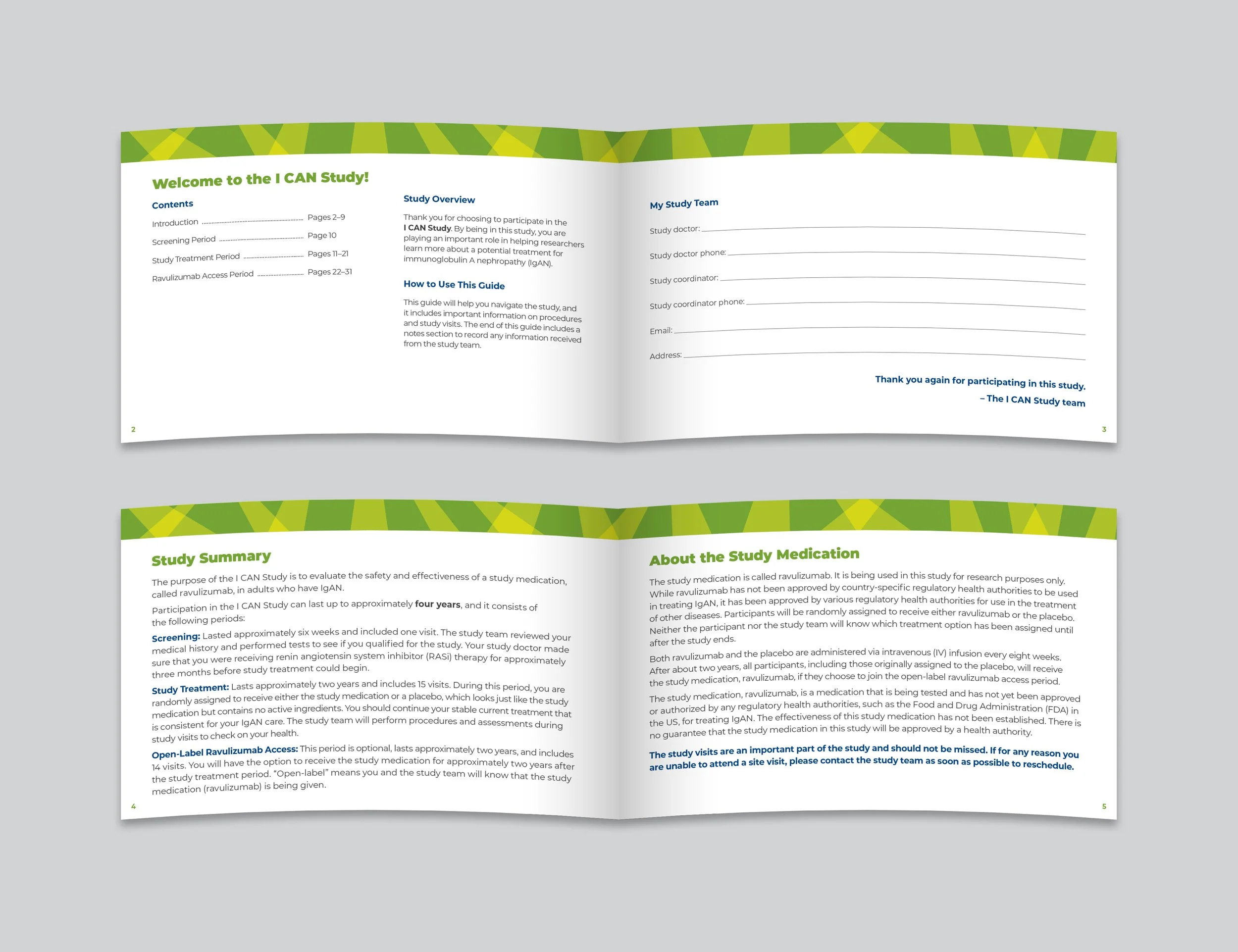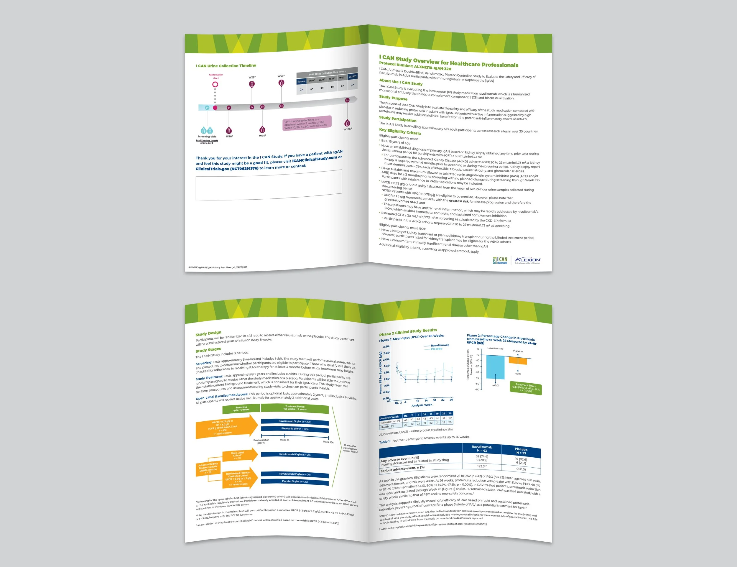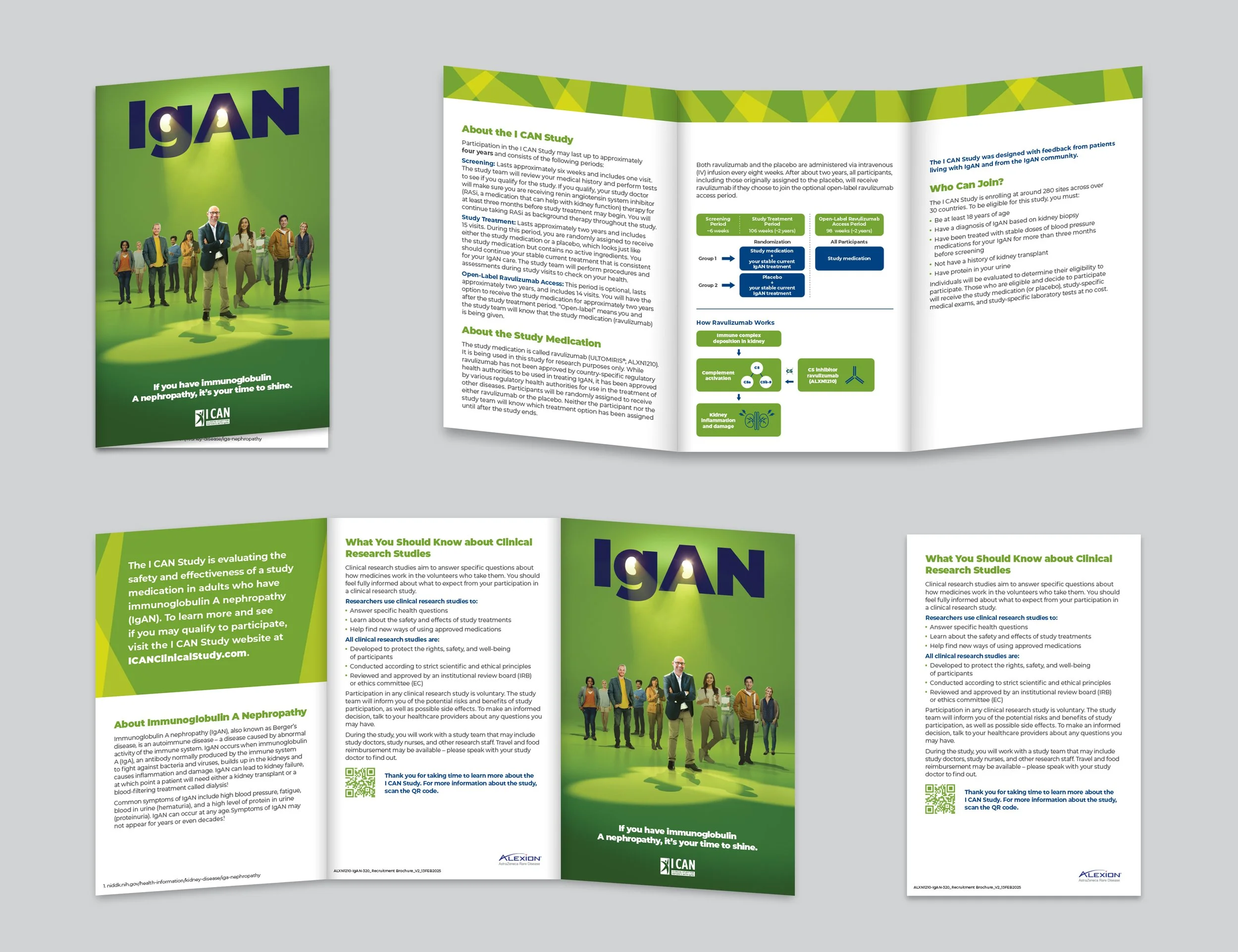 The I CAN Study is a clinical research study sponsored by Alexion that evaluates a medication for treating Immunoglobulin A Nephropathy (IgAN). These study materials were developed to support patient recruitment, physicians, study sites, and outreach groups. My role in the process was creating a design treatment and layouts, as well as preparing the files for print.